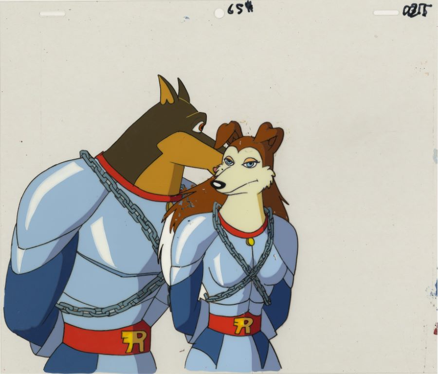 A production cel from the Warner Bros. Studios animated series Road Rovers (1996-1997). Featuring Blitz and Colleen tied up in chains, the hand-painted cel was created at the studio and used during the animation process. Measuring 9"x10.5" overall, with an image measuring 7.25"x7", the cel is in good condition with some wear and paint loss particularly on Colleen.