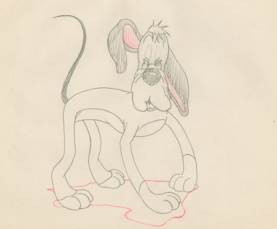 A production drawing from the Warner Bros. animated series "Merrie Melodies" (1931-1969). Featuring Willoughby the lanky dog, the graphite drawing was created at the studio and used during the animation process of the short film "The Crackpot Quail," which aired in 1941. Measuring 9.5"x12" overall, with the character image measuring 6.5"x4.5", the drawing is in very good condition with page discoloration and edge wear, likely due to age and handling.